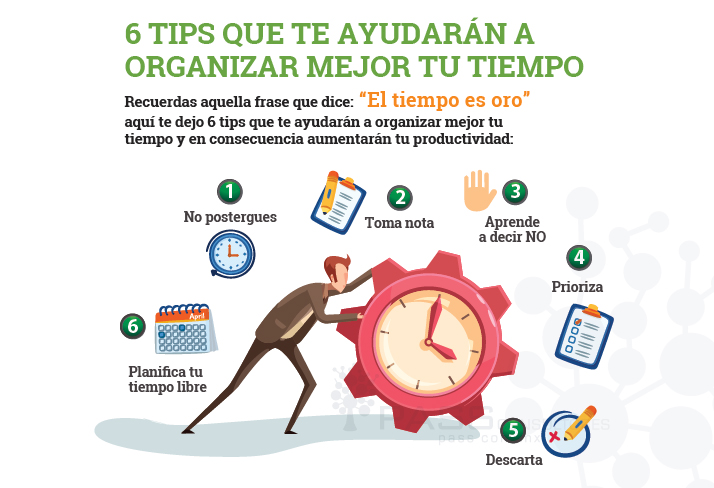 Recuerdas aquella frase que dice: “El tiempo es oro”, aquí te dejo 6 tips que te ayudarán a organizar mejor tu tiempo y en consecuencia aumentaran tu productividad: No postergues Todas las tareas que no tienes ganas de hacer y a las que solo les estás dando largas, ponles fecha para realizarlas y de ser posible hazlas lo antes posible. Hazlas cuanto antes y evitarás el estrés y la culpabilidad que se genera al aplazarlas.Toma nota Es mucho más el tiempo que le inviertes a estar pensando una tarea que debes hacer y la vuelves a recordar más...