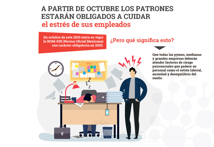 En octubre de este 2019 entra en vigor la NOM-035 (Norma Oficial Mexicana) con carácter obligatoria en 2020. ¿Pero qué significa esto? Que todas las pymes, medianas y grandes empresas deberán atender factores de riesgo psicosociales que padece su personal, como el estrés laboral, ansiedad y desequilibrio del sueño. De acuerdo con la NOM, el objetivo es propiciar un entorno organizacional favorable y proteger la salud mental de los trabajadores mexicanos. Algunas de las acciones que se deberán realizar son las siguientes: · Identificación de factores de riesgo. · Acciones de control seguras y confidenciales. · Aplicación de exámenes médicos ante señales de alarma....